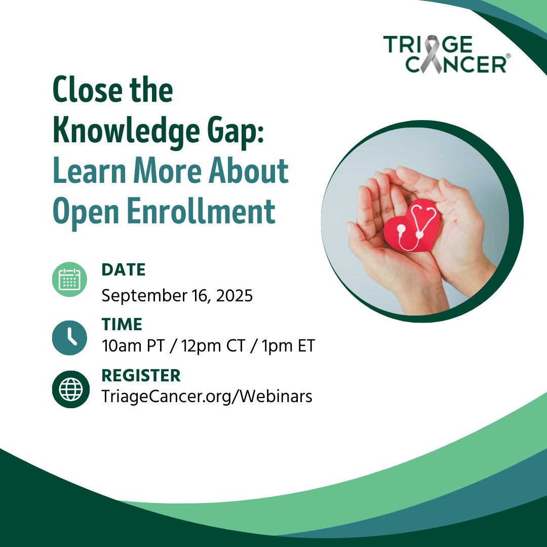 | | |  | Join our friends at @TriageCancer for a FREE webinar about Open Enrollment on 9/16! This webinar will take the mystery out of the open enrollment process. Attendees will learn basic health insurance terms and tips for comparing and picking health insurance plans. REGISTER HERE |