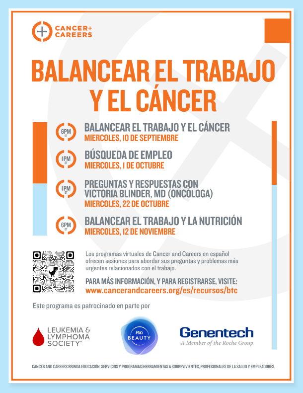 | | Attention Spanish speakers - join our friends at Cancer + Careers for a free, four-part virtual series in Spanish on navigating work after a cancer diagnosis. The Balancear el Trabajo y el Cáncer series returns next month with new topics (in Spanish) and is open to anyone affected by cancer, including patients, survivors, family, caregivers, and healthcare professionals. Upcoming sessions: - Webinar: Balancing Work and Cancer – September 10, 6PM ET/3PM PT