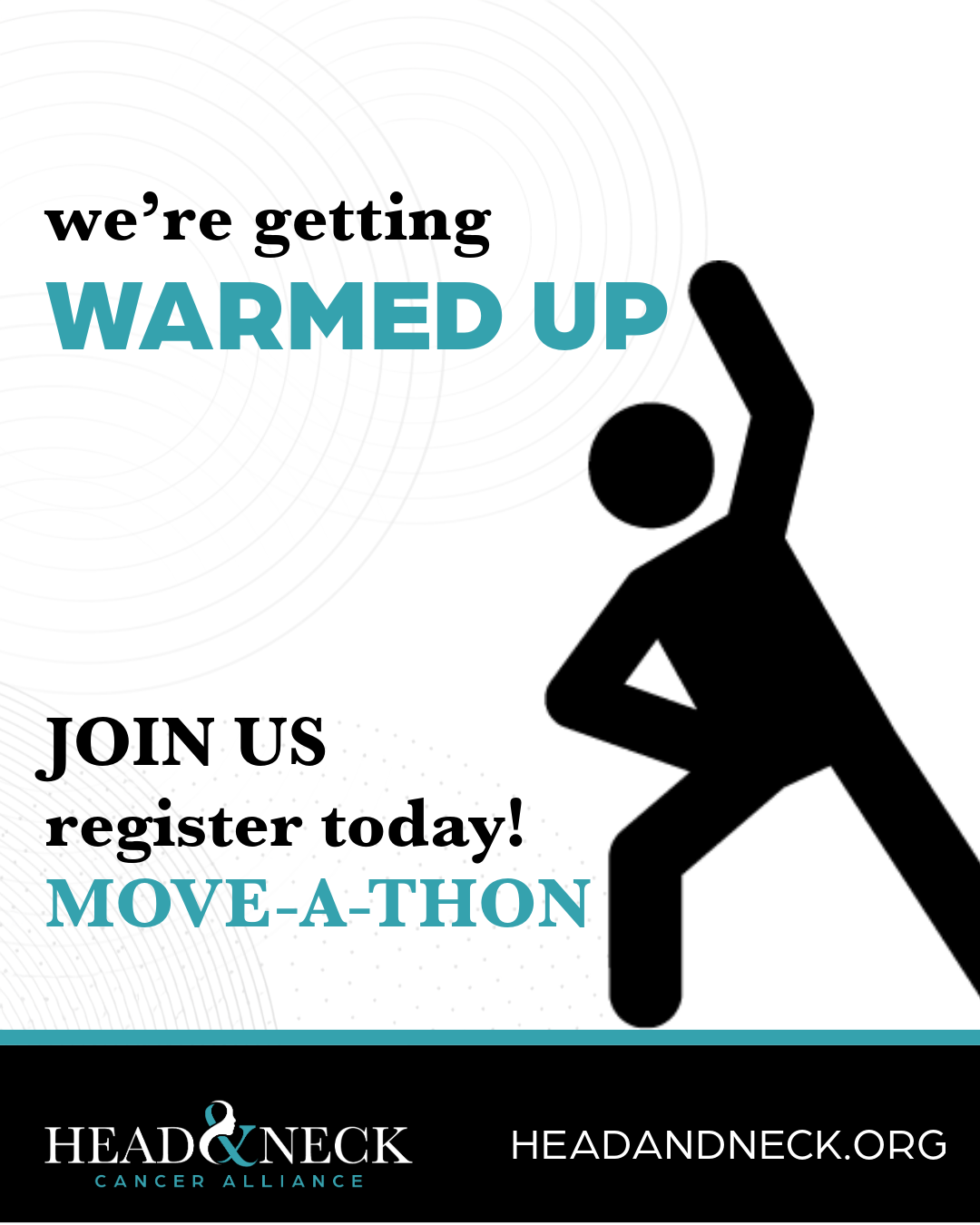 | READY, SET, MOVE! Our annual Move-A-Thon event is "kicking" off this month. We encourage you to think about how you want to "move" with us (you decide - it could be running, walking, playing with your kids - whatever you want and feel capable of doing). Consider if you want to start your team, join an existing team, or help us raise funds and awareness on your own. April is Head & Neck Cancer Awareness Month and we would love you to MOVE with us! Note: We host drop-in meetings to help with questions about starting or managing a team, or with registration. Full details are on our website. Next meeting: Sat, Jan 17, 12 p.m. ET |