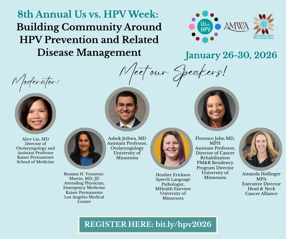 | | US vs. HPV Week Us vs HPV Week runs from January 26 to January 30, 2026. It's a free, virtual series of webinars and events to boost awareness of HPV and HPV-related disease prevention and care. You can join live sessions each day to learn from experts and communities working on vaccination, education, screening, equity, and support. On Thursday, January 29, our Executive Director, Amanda Hollinger, presents in the session on support and empowerment for people living with HPV-related cancers. Register online and tune in each day to participate in webinars and interactive Q&A |