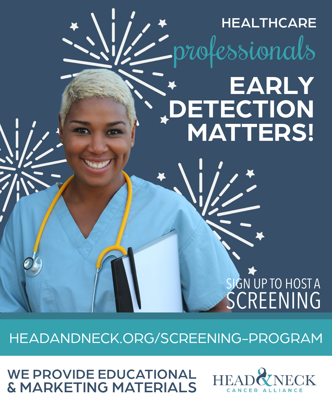 |  | HOST A SCREENING For more than 20 years, the Alliance has partnered with organizations around the world to raise awareness and save lives through community health screenings focused on early detection and education about head and neck cancer. You can host a screening during April’s Head and Neck Cancer Awareness Month or at any time of year. We provide free educational and promotional materials. You provide the staff and volunteers. We make it simple to get involved. |